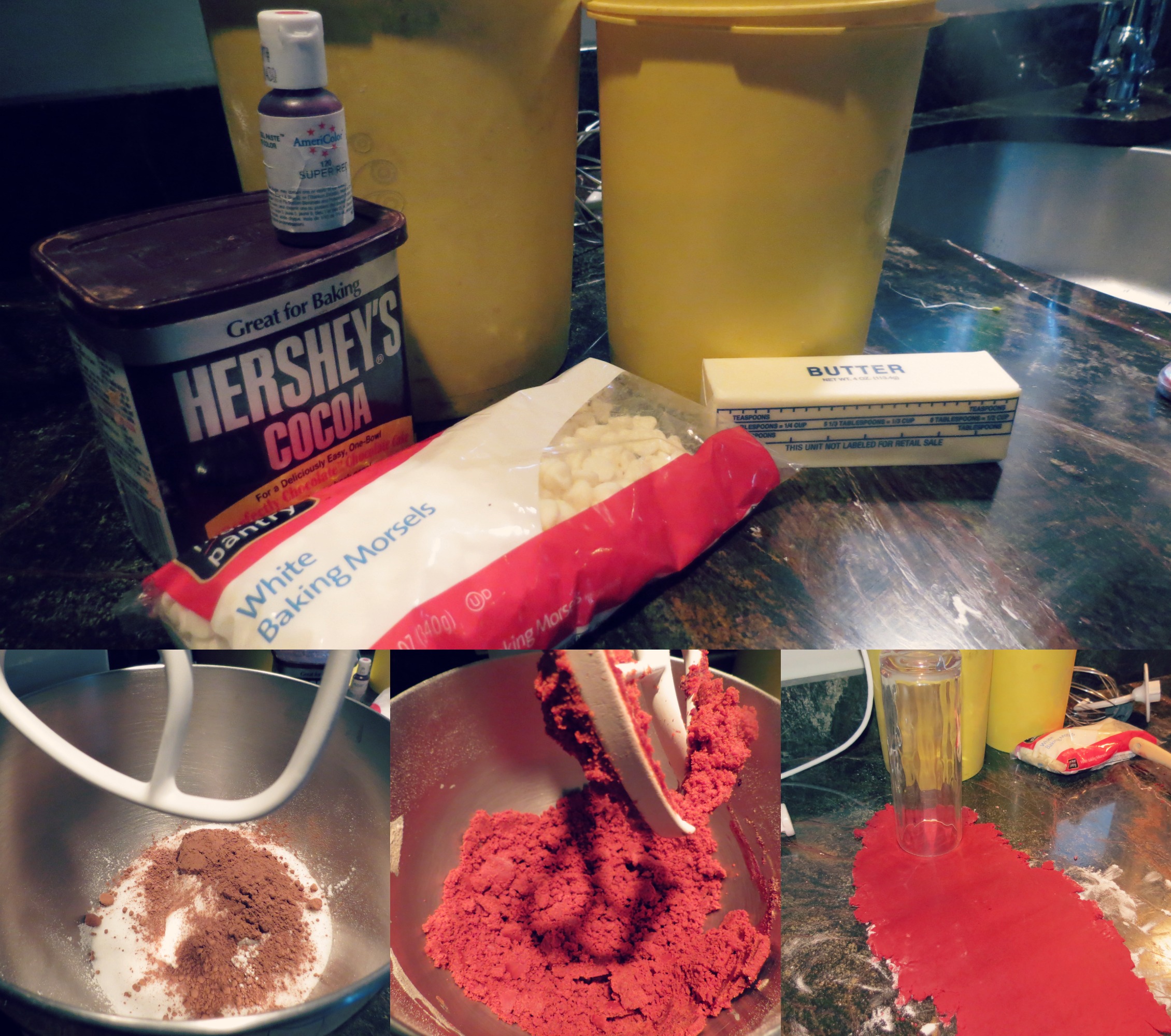 Making these cookies was a little more complicated than I anticipated. I used the electric mixer (which is a life saving tool) but the dough took a long time to form and I ended up having to knead it with my hands a lot. This led to my hands looking bloody and scary for the next day because of all the food coloring that was in the dough!